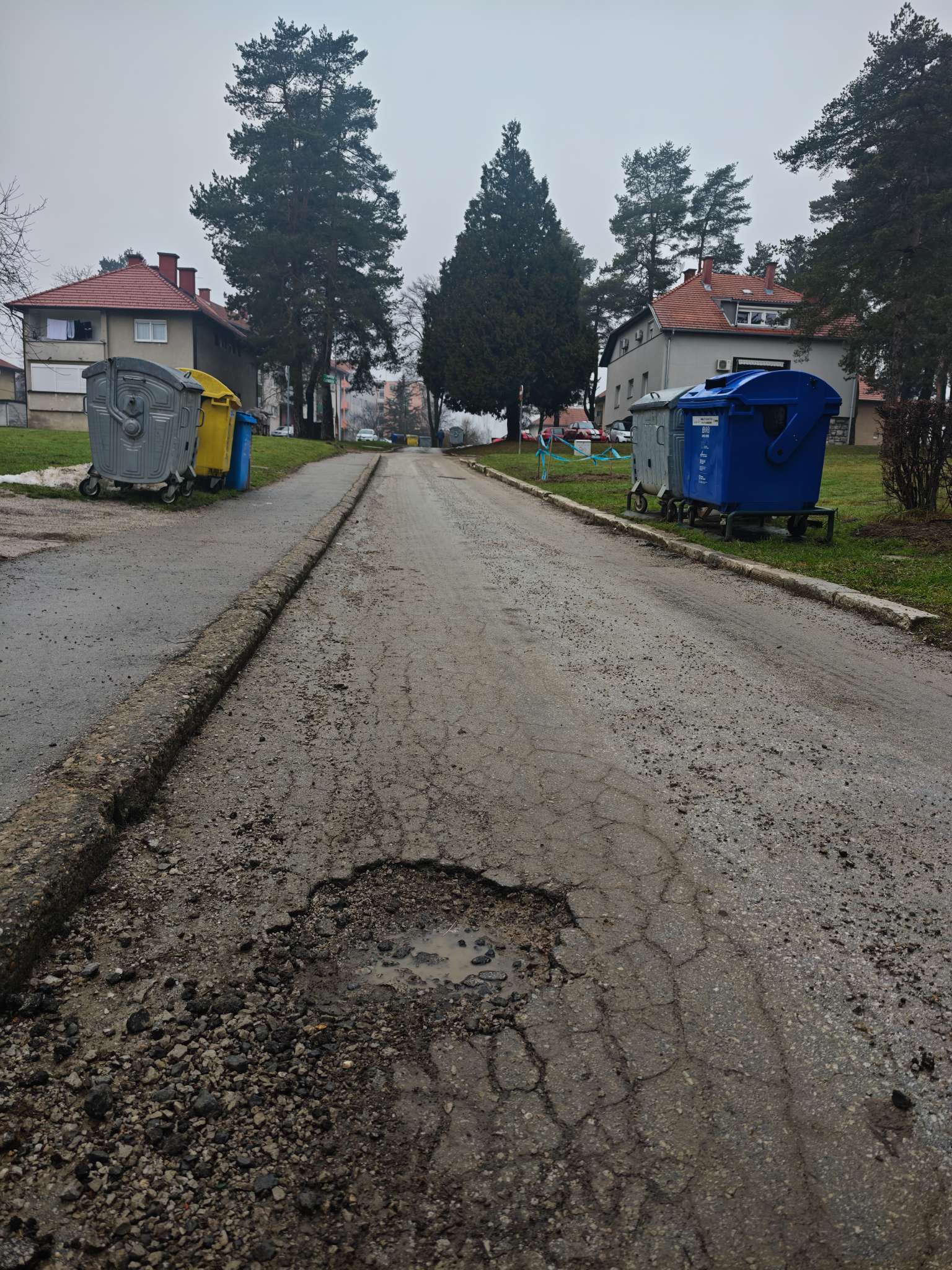 Oštećenje ceste je nastalo nakon čišćenja snijega ralicama u periodu od 12. do 1. mjeseca ove godine. Nalazi se pored ulaza Mrežnička 2, Švarča.
