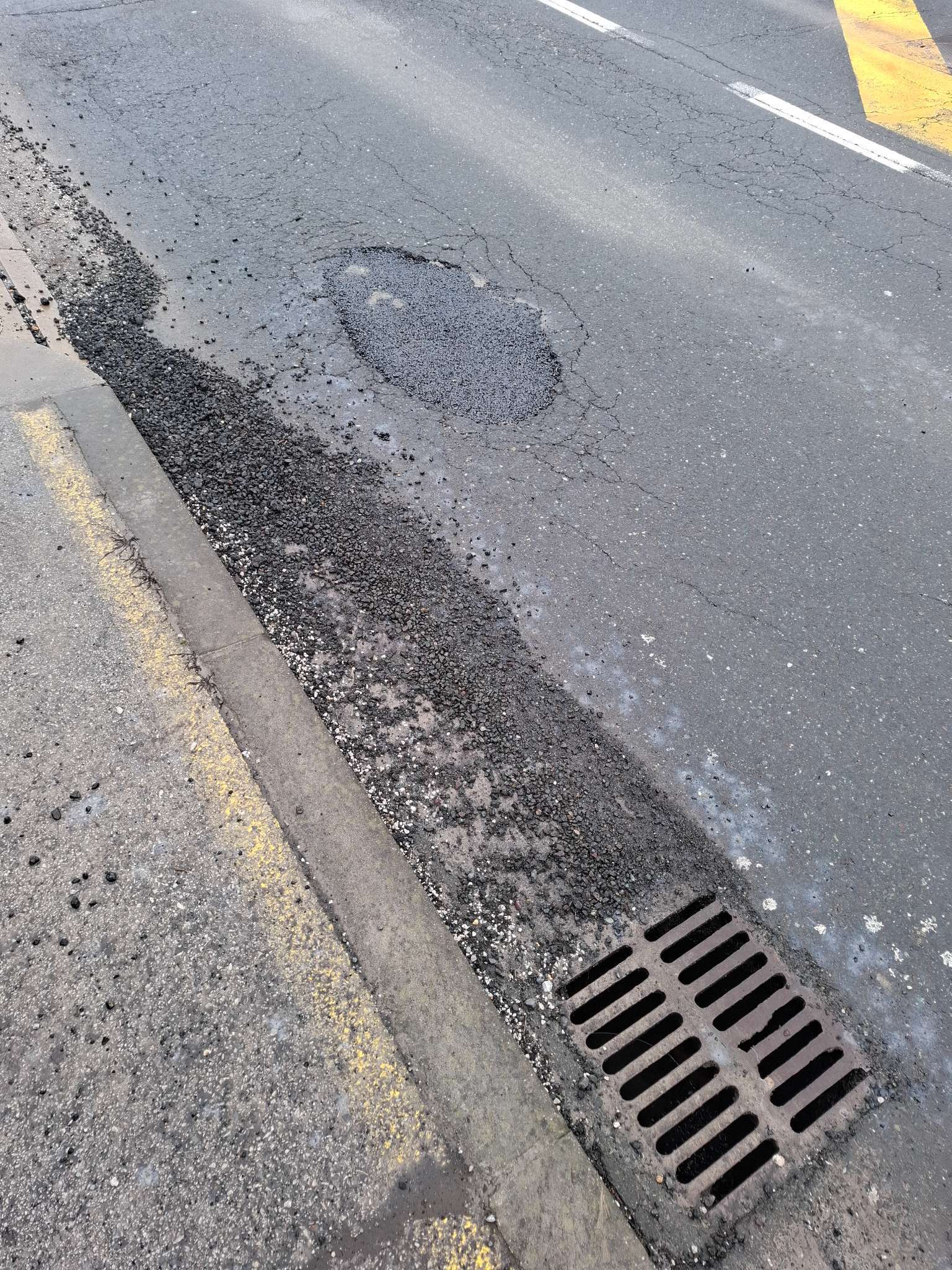 Pokrpano danas neadekvatno na mokru podlogu lopatarenjem..zakrpa vec propala u odnosu na cestu..oko zakrpe ispucan asfalt koji ce se opet izvaliti za par dana..zakrpa niža od šahta..a asfaltno kamenje ne očišćeno..te opet gađa pješake pd kotačima auta..a kamenje sve rasipano do odvoda vode..pa nema ni koliko toliko odvodnje...slična stvar 15 metara dalje na kč broj 83...